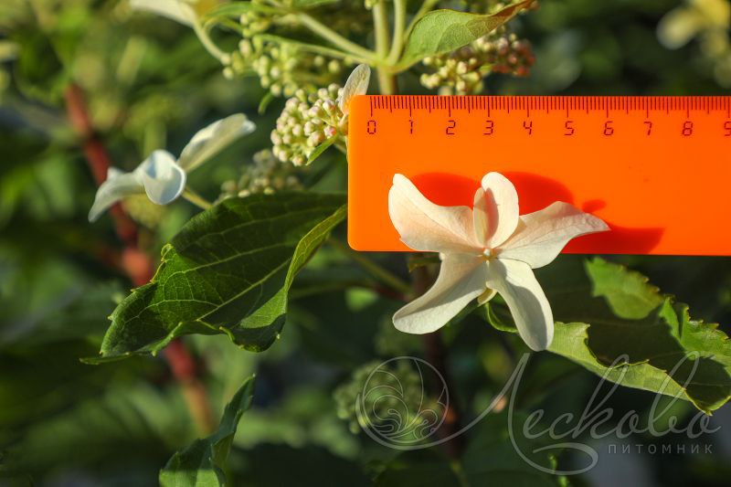 Цветы сначала белые, позже приобретают нежный жемчужно-розовый цвет.