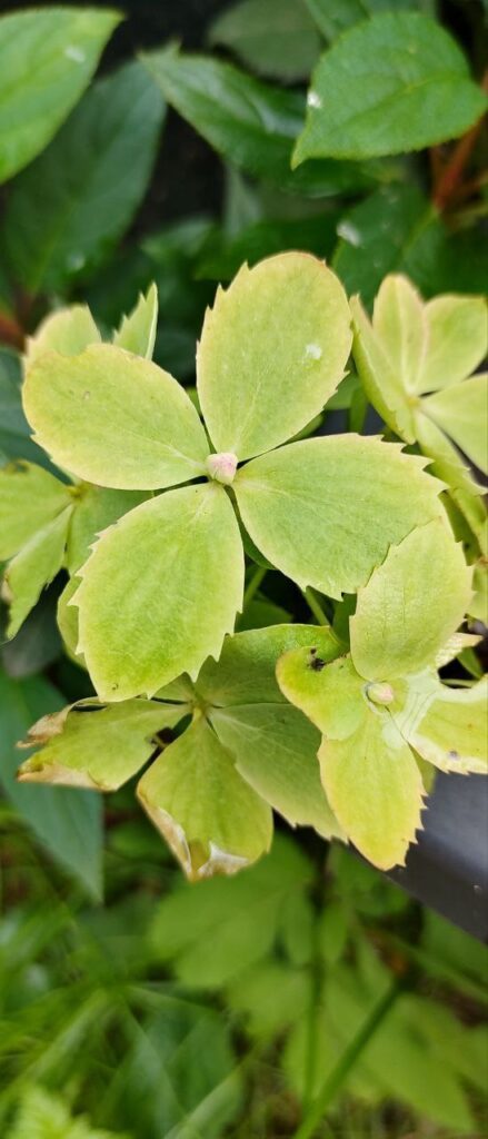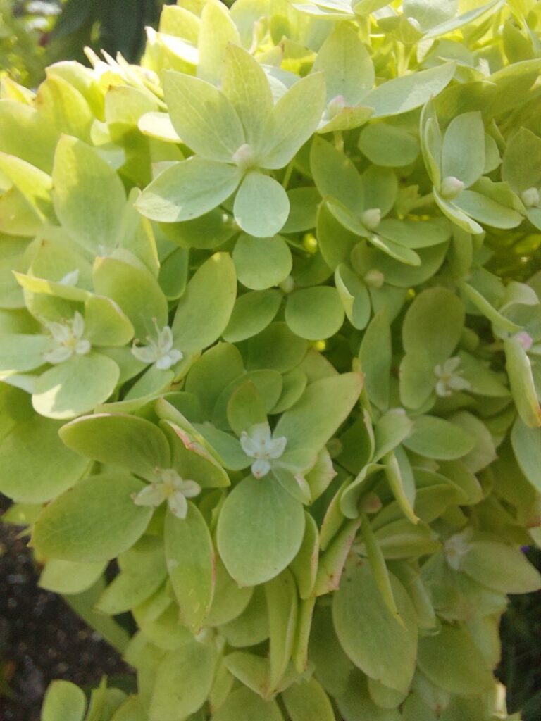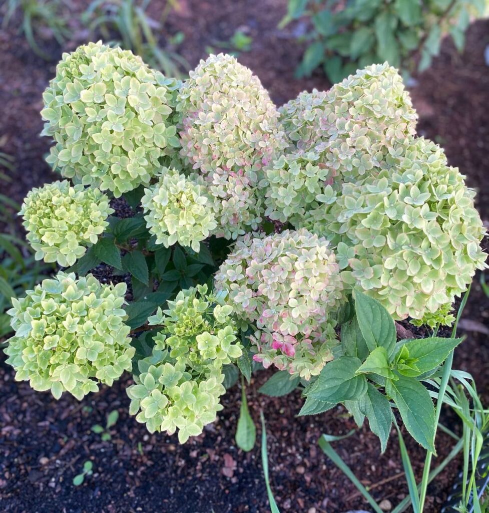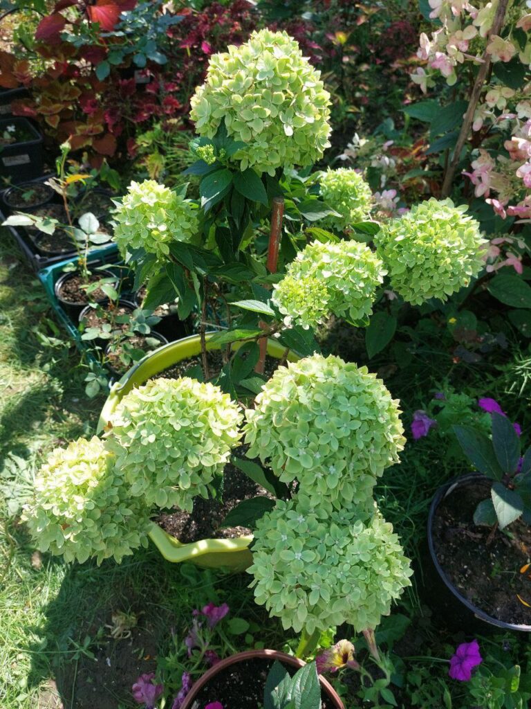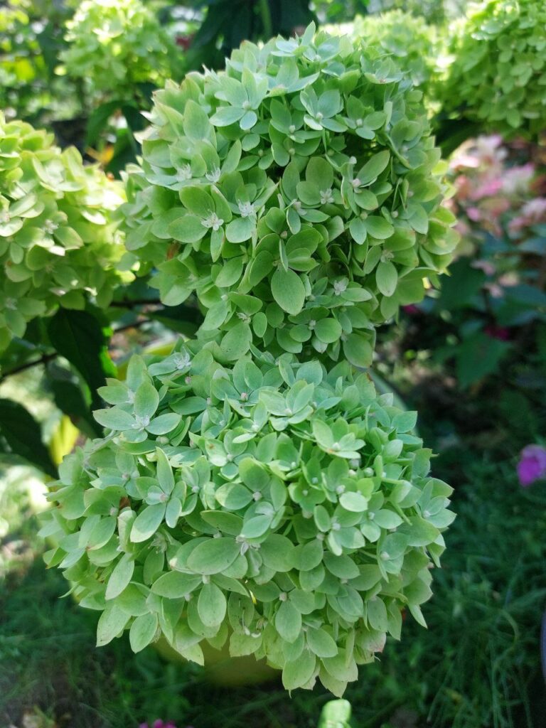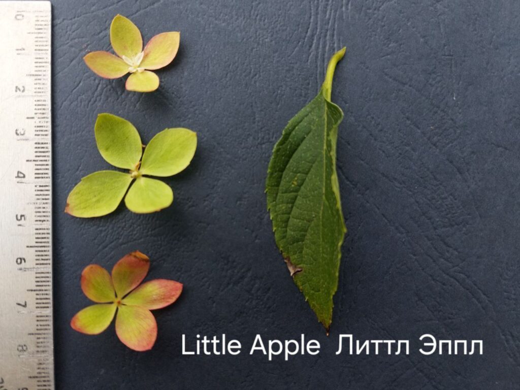 Плотные, круглые, некрупные, соцветия из стерильных цветов. Цветение из зелёного уходит в багрянец.