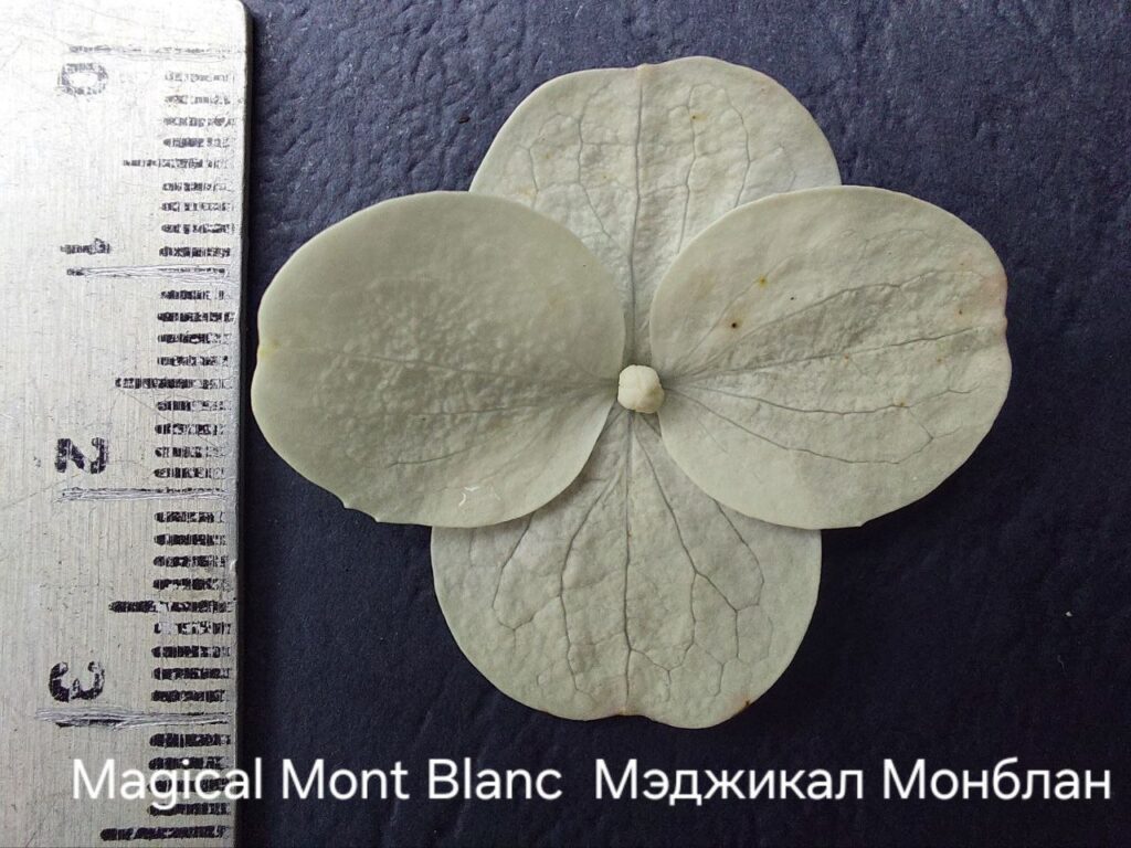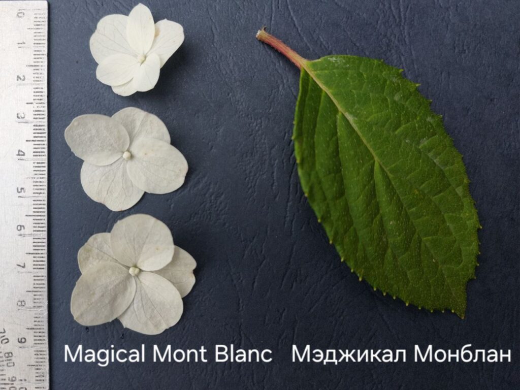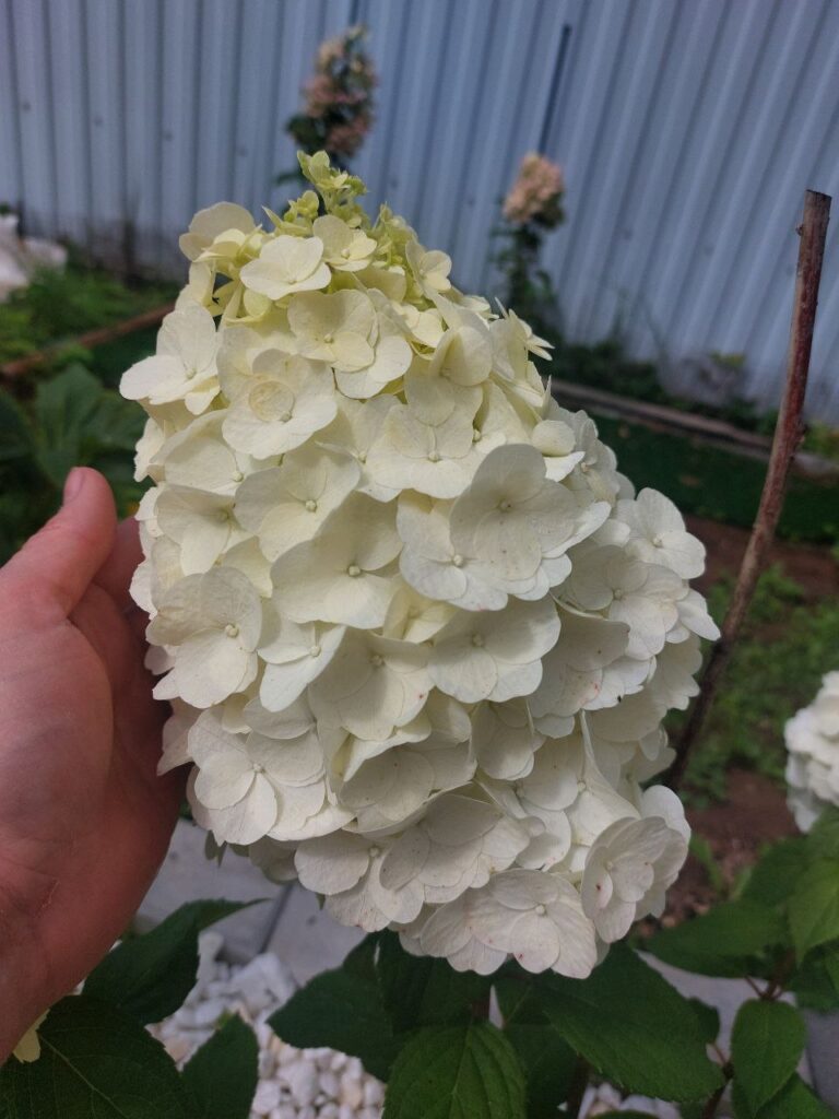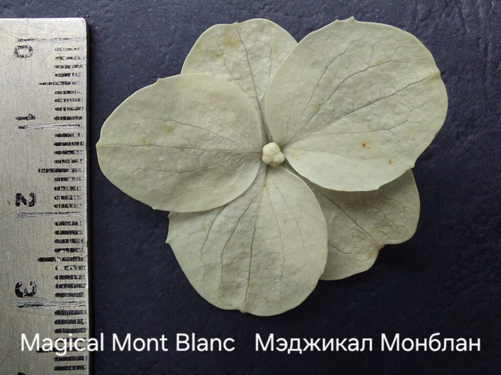 Соцветия плотные, широкие конусы, крупные, 25 см, из стерильных цветов.