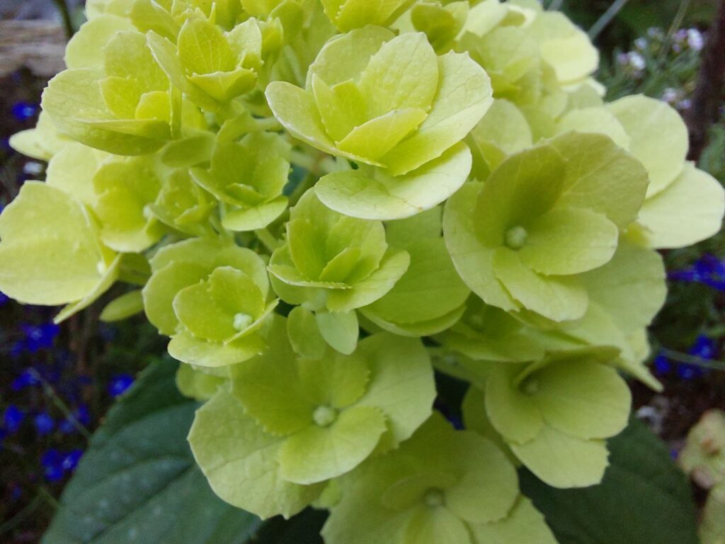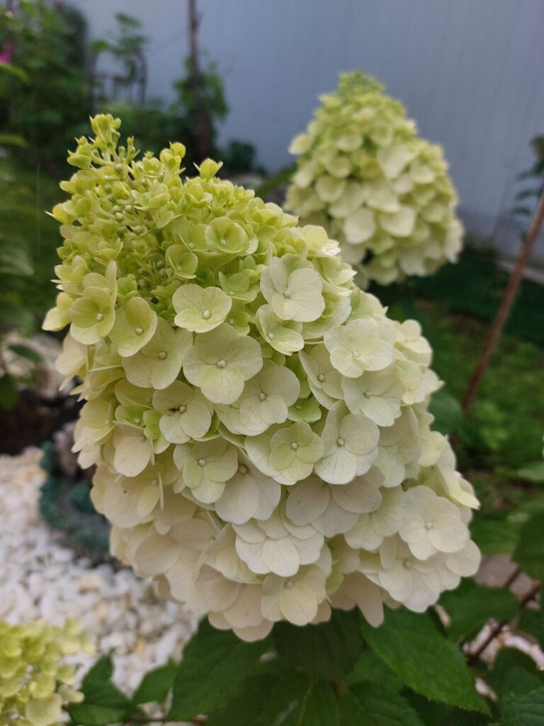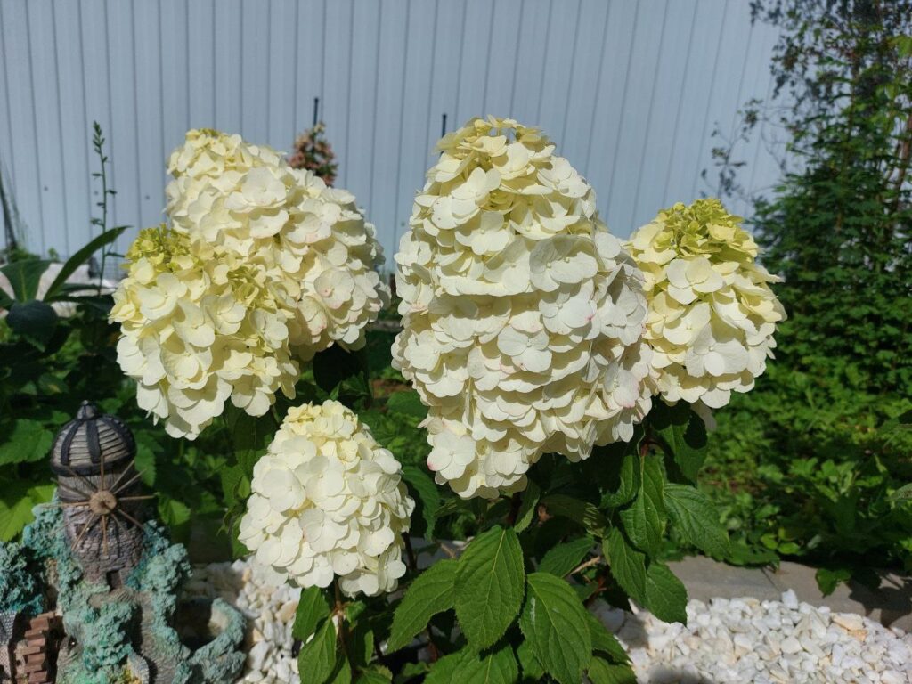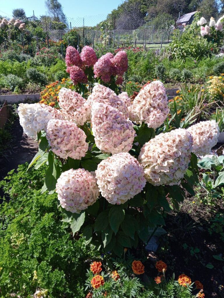Соцветия плотные, широкие конусы, крупные, 25 см, из стерильных цветов.