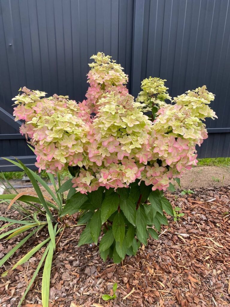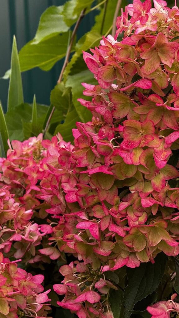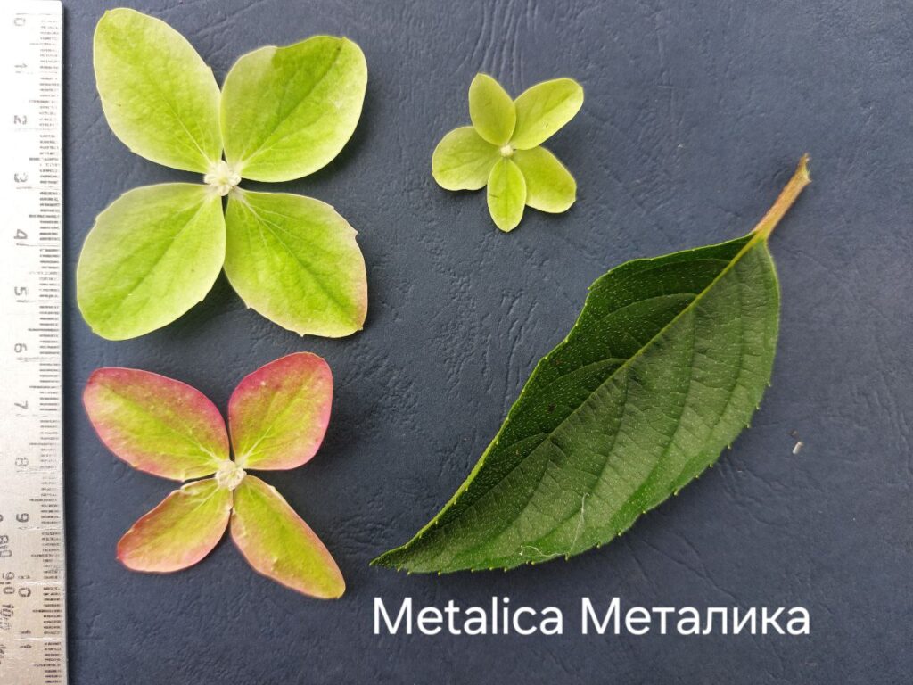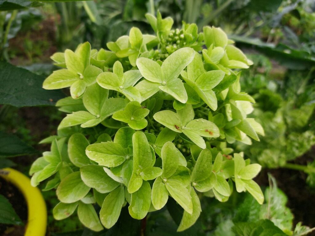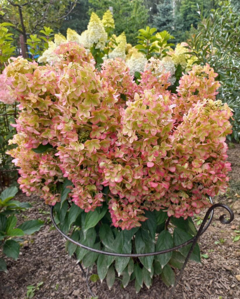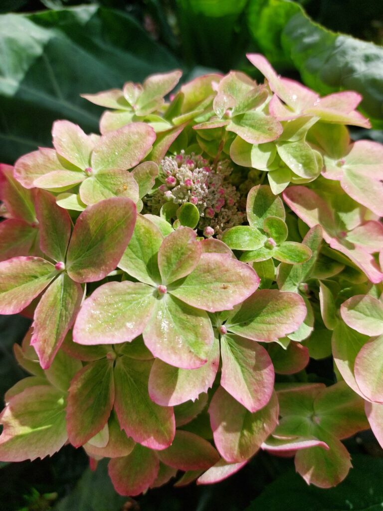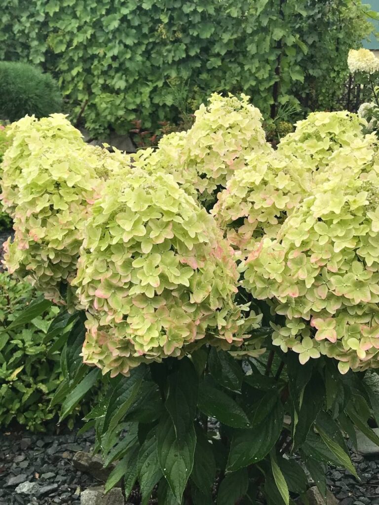 Соцветия с округлой верхушкой, очень крупные, длиной до 50 см, плотные, состоят из огромных стерильных цветков, с небольшим вкраплением фертильных. Зелёные или лаймово-белые в начале, постепенно образуется розовая кайма, в финале цветения они становятся малиново- бордового цвета.