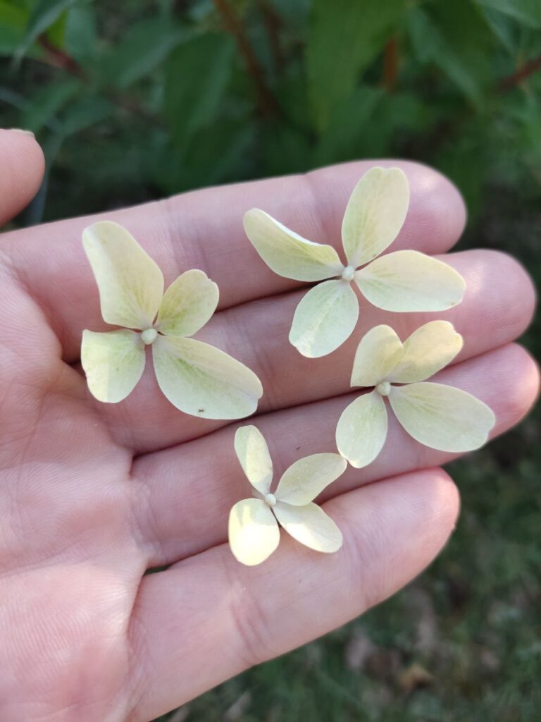 Лепестки — прямоугольно-овальные, вытянутые, часто с выемкой, чуть касаются друг друга.
