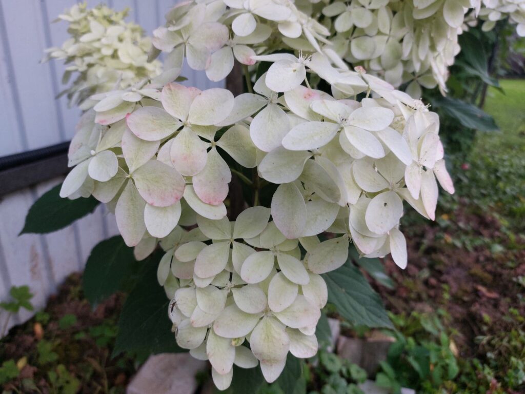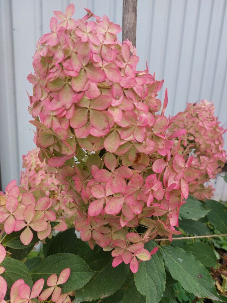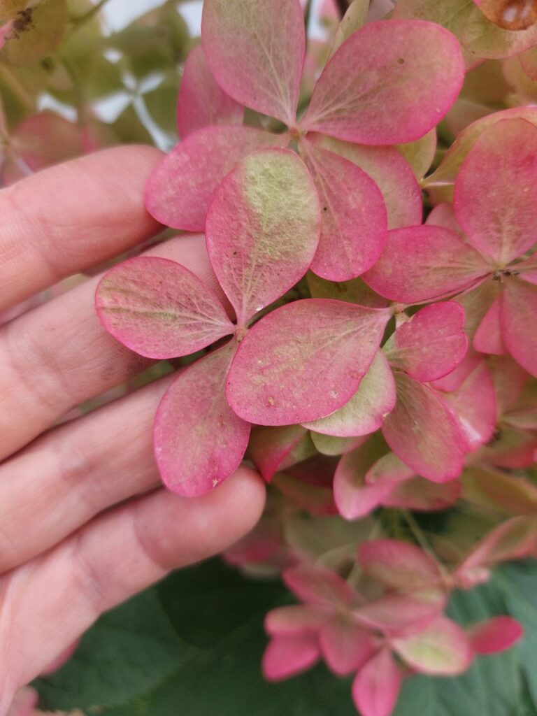 Изменение цвета — от белого в оттенки розового всё соцветие целиком.