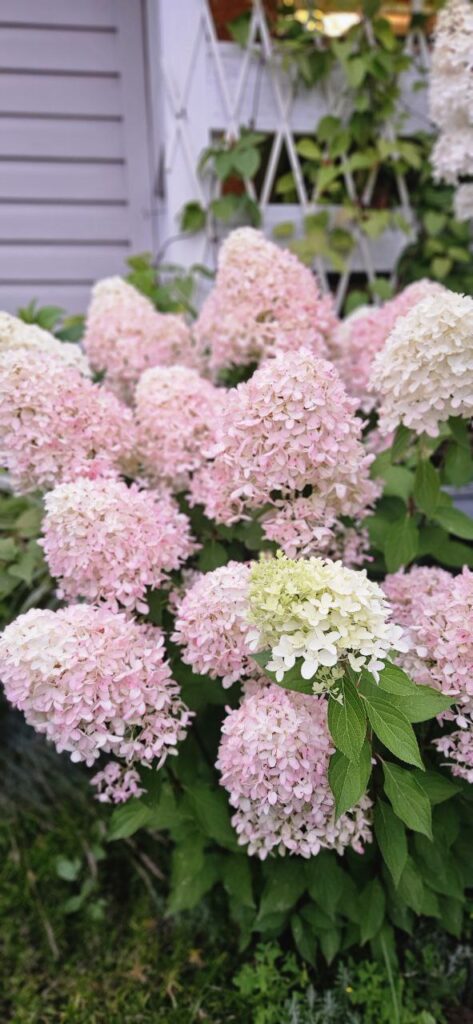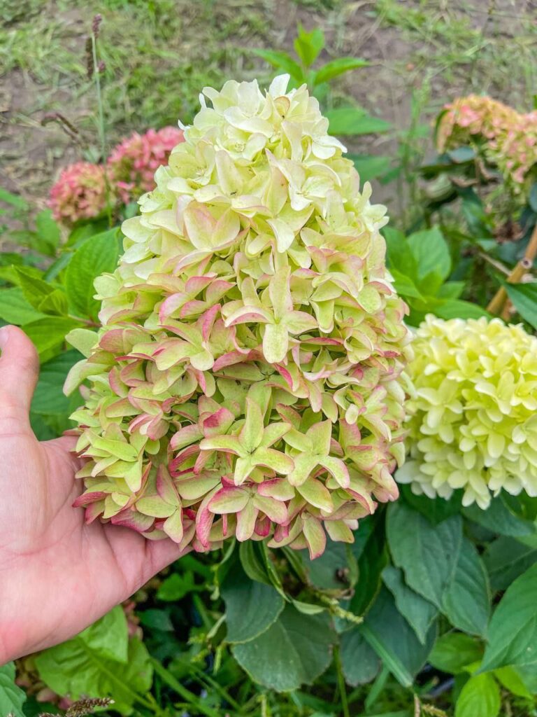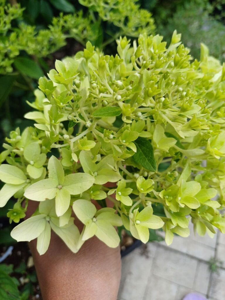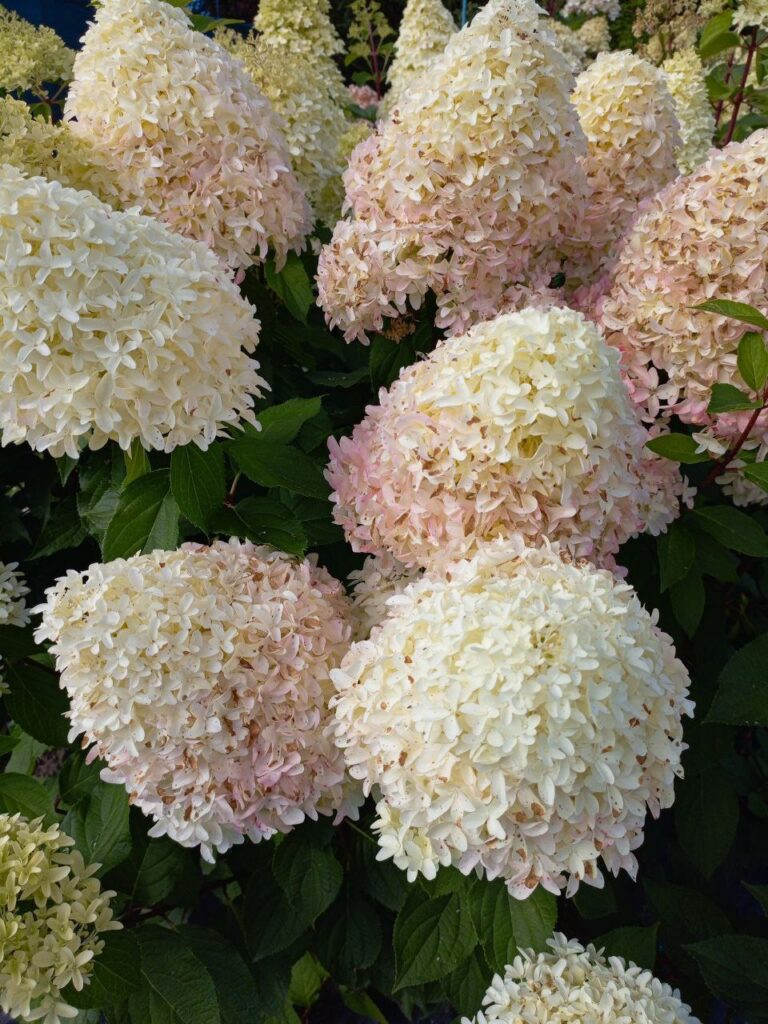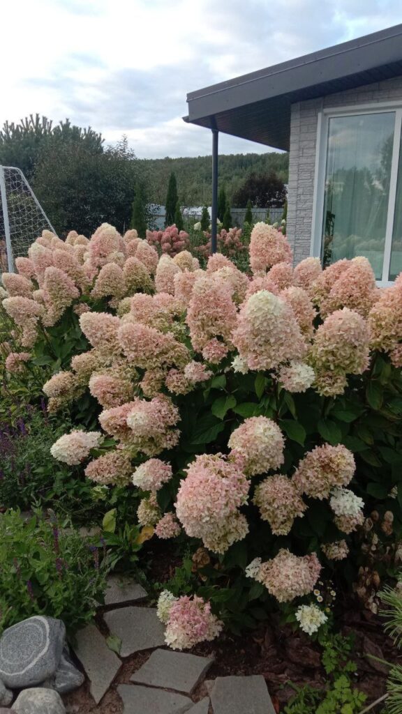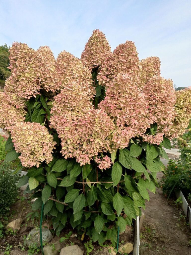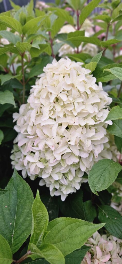 Плотные, крупные, конусообразные соцветия из стерильных цветов. Цветение из белого в бледно розовый.