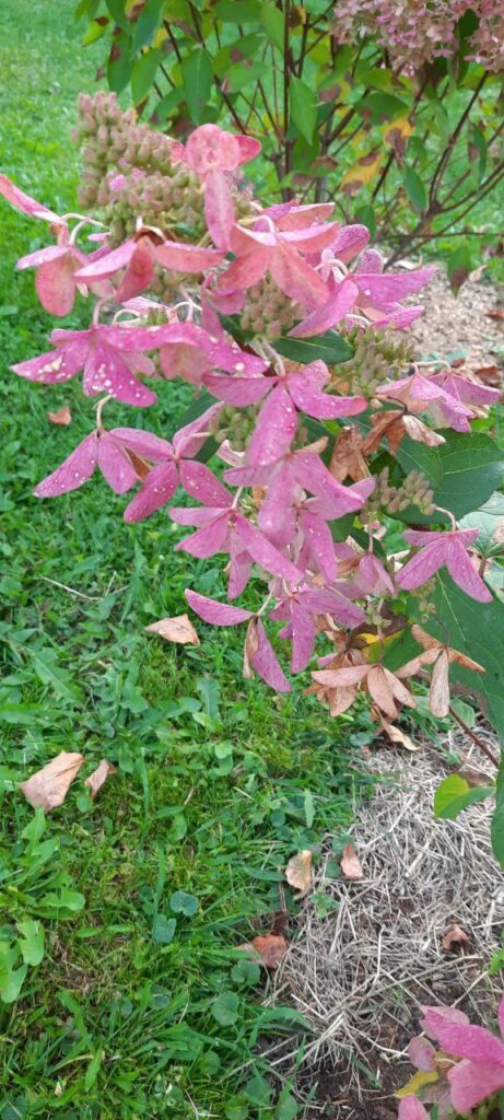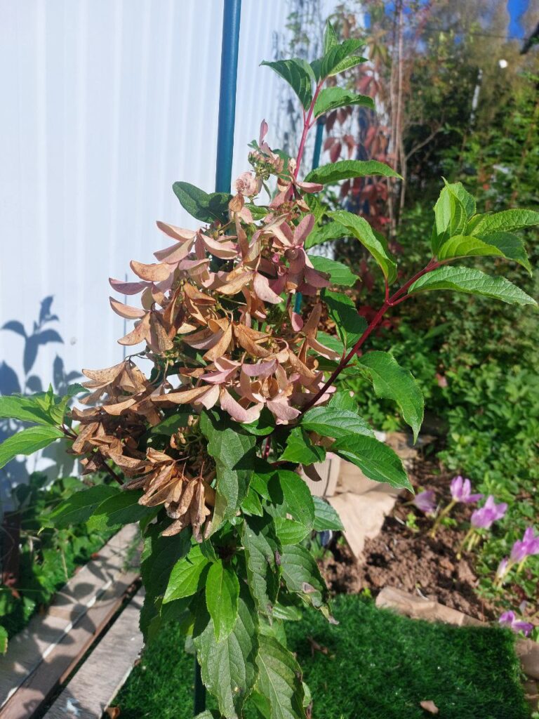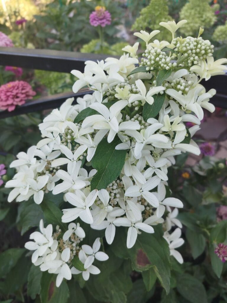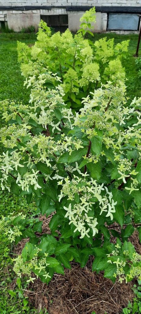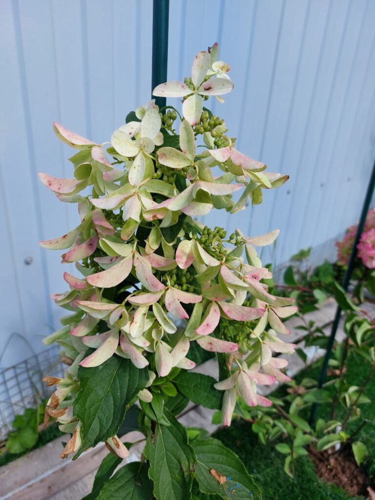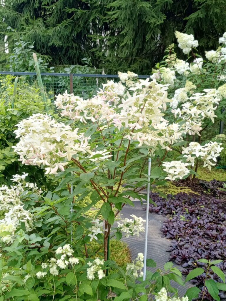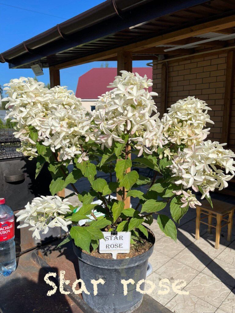 Рыхлые, крупные, конусообразные соцветия из стерильных цветов и фертильных цветков. Цветение из белого в пыльно розовый.