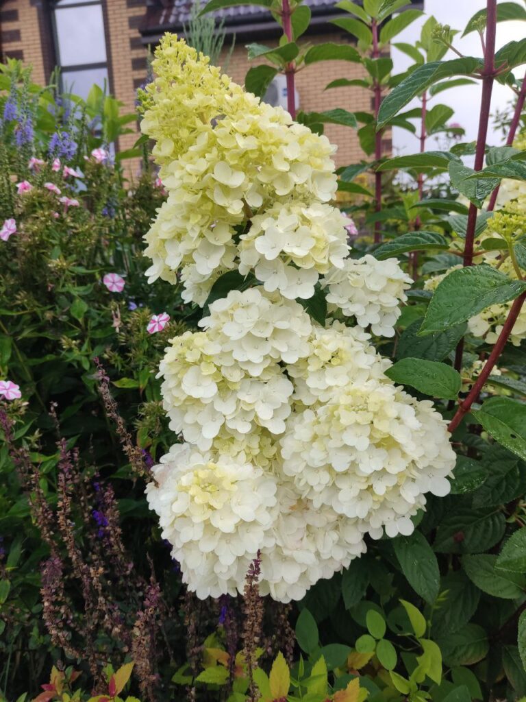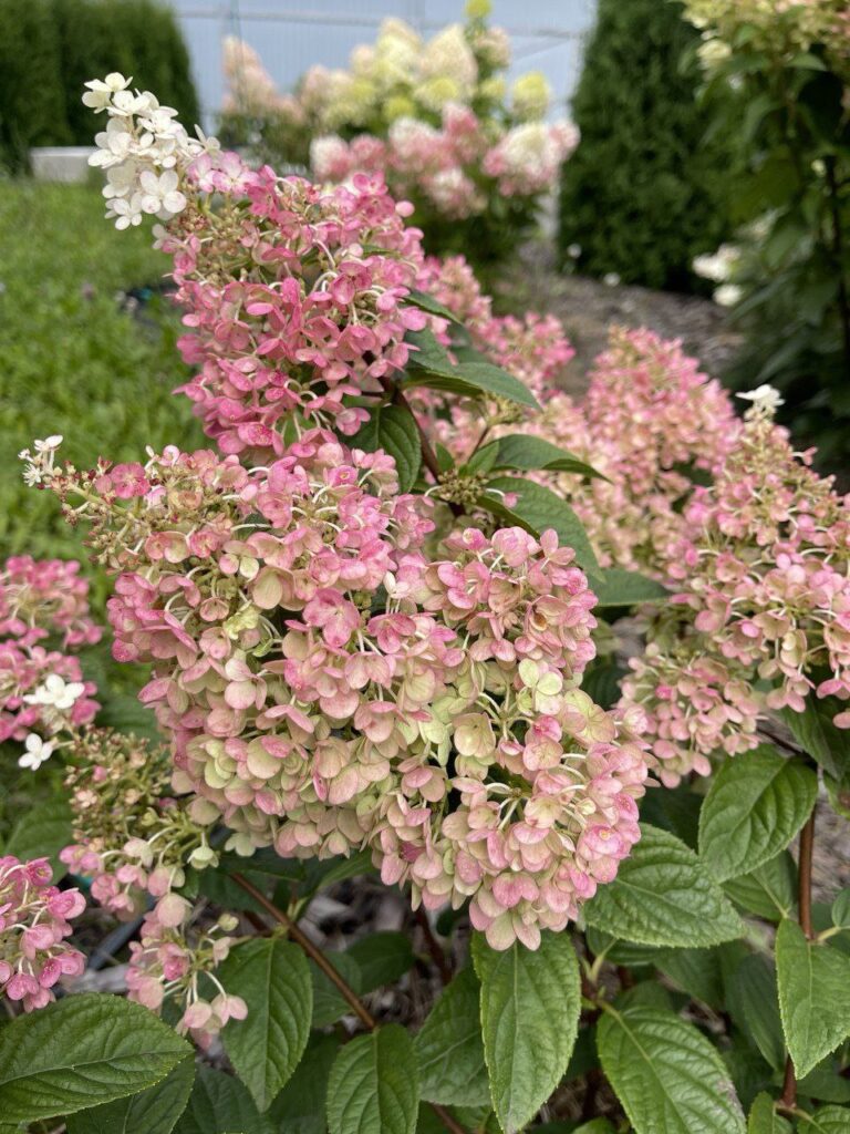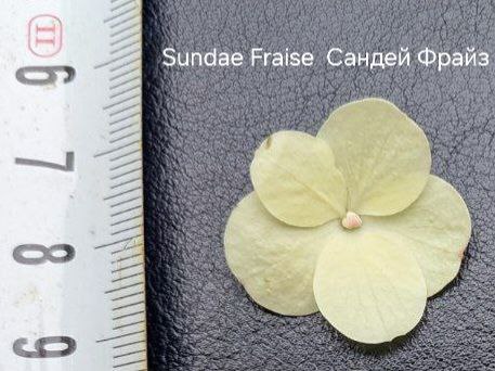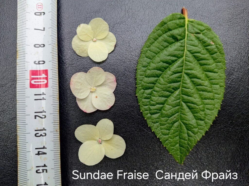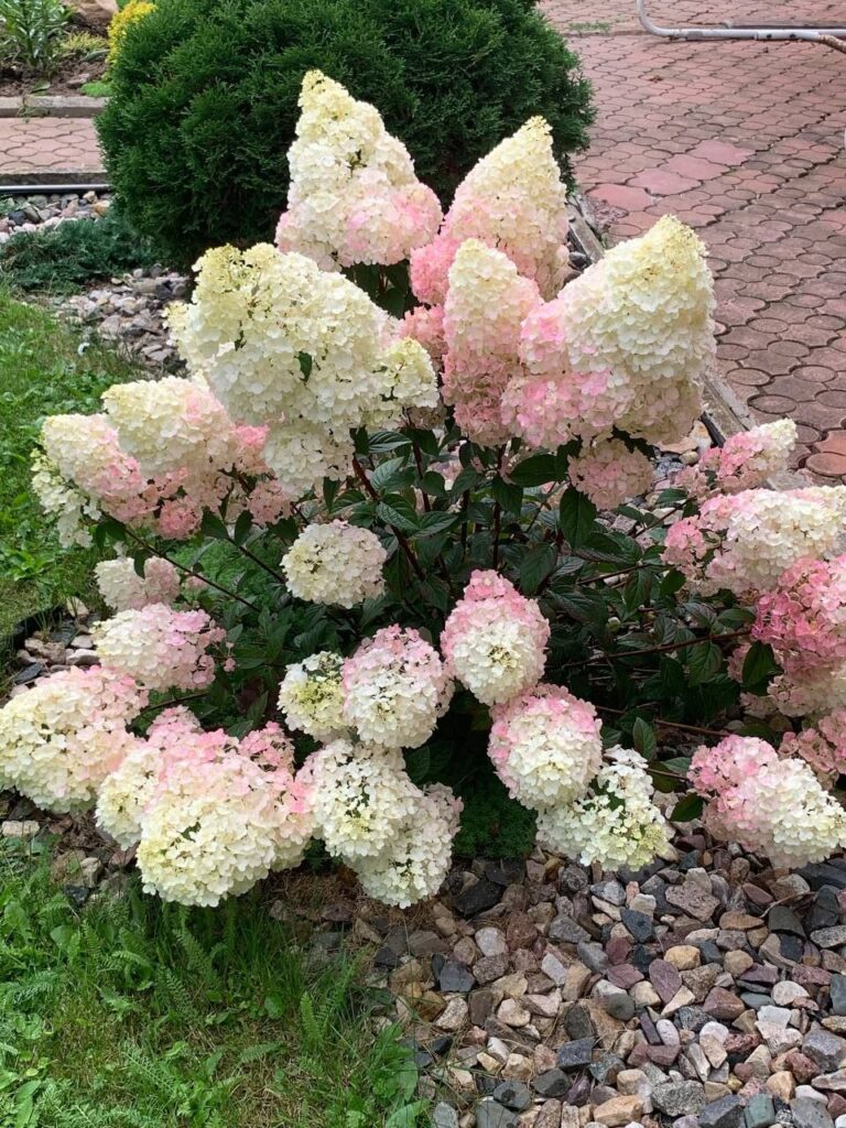 Плотные, крупные, конусообразные  соцветия из стерильных цветов. Цветение из сливочного в розовый с белым кончиком.