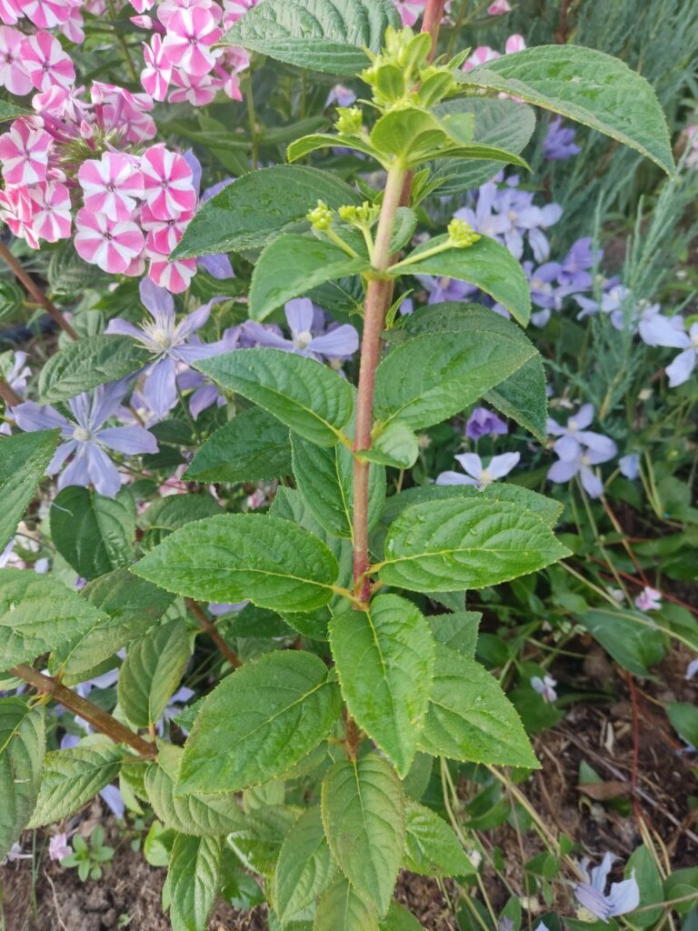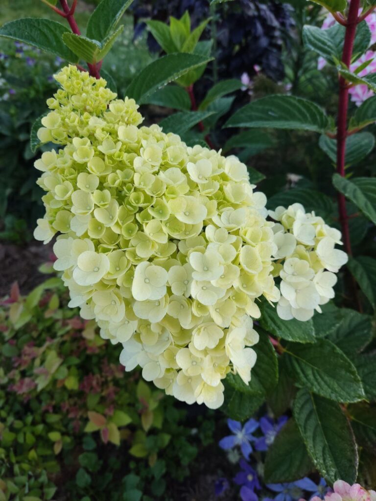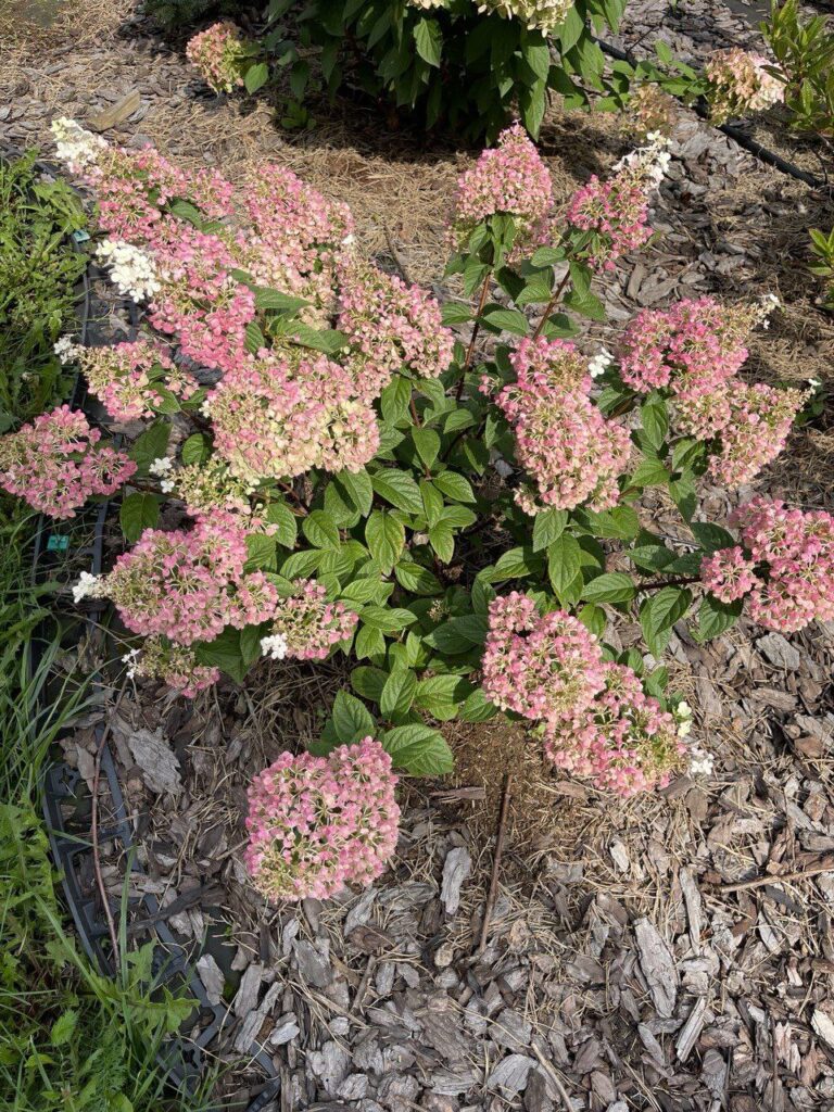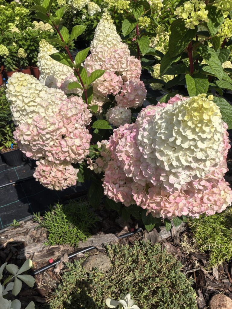 Плотные, крупные, конусообразные  соцветия из стерильных цветов. Цветение из сливочного в розовый с белым кончиком.