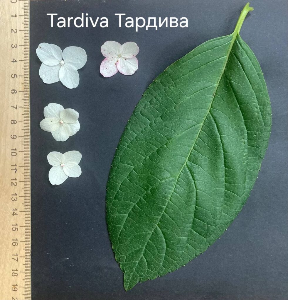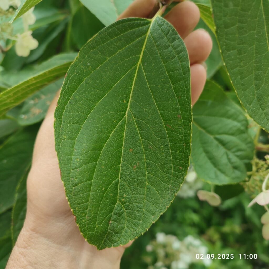 Лист — большой, заострённый, мелкозубчатый.