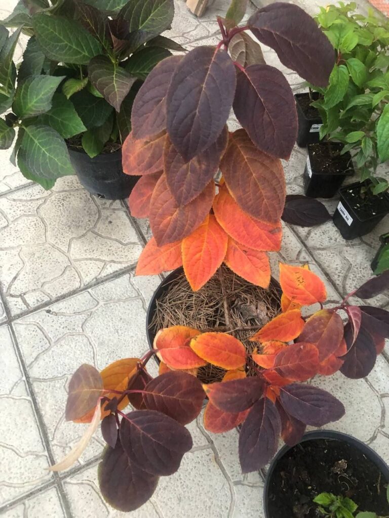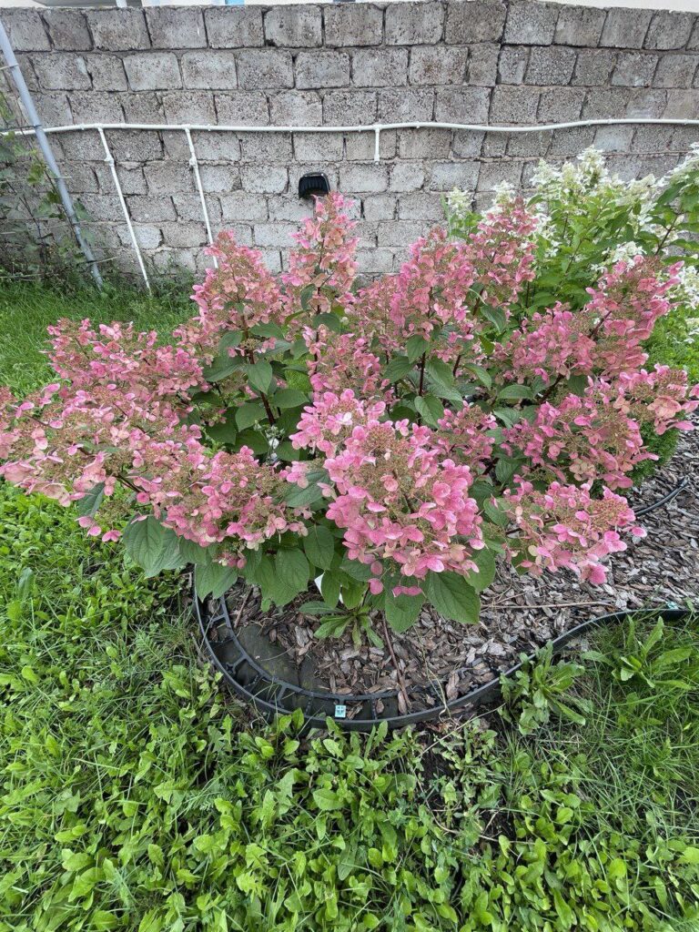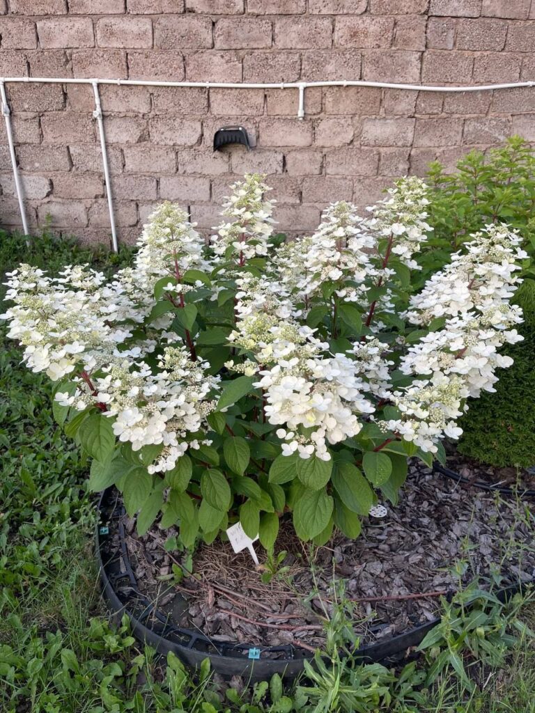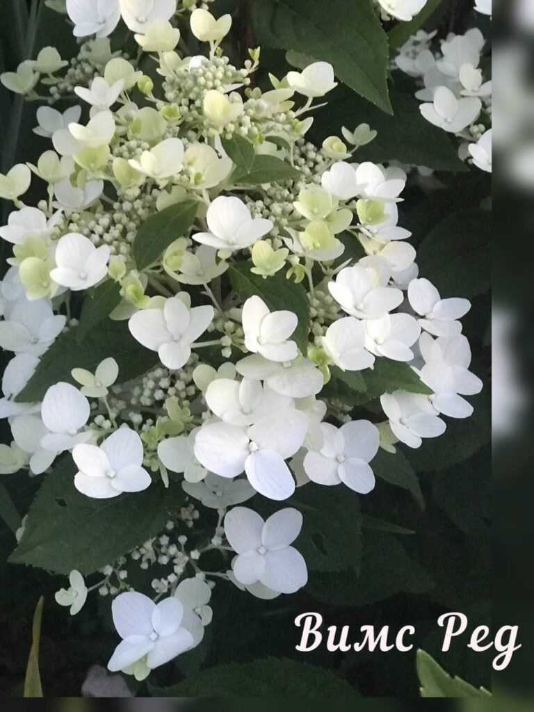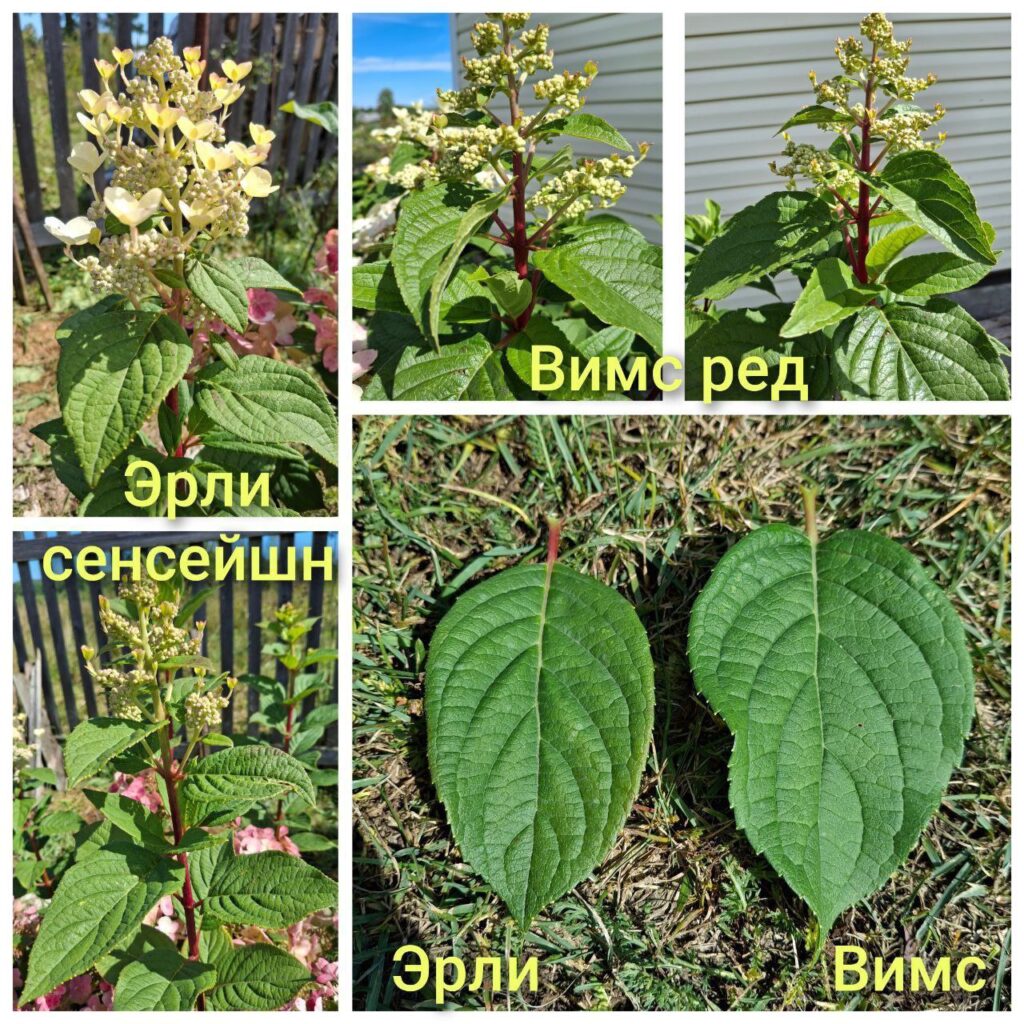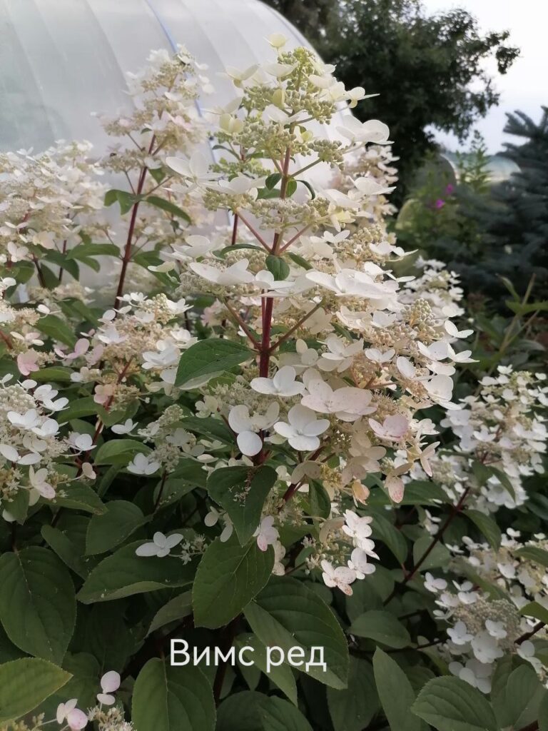 Рыхлые, крупные, пирамидальные соцветия из стерильных цветов и фертильных цветков. Внутри метёлки стволик красный.